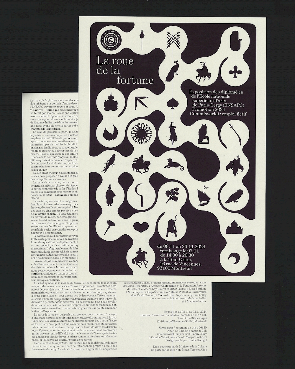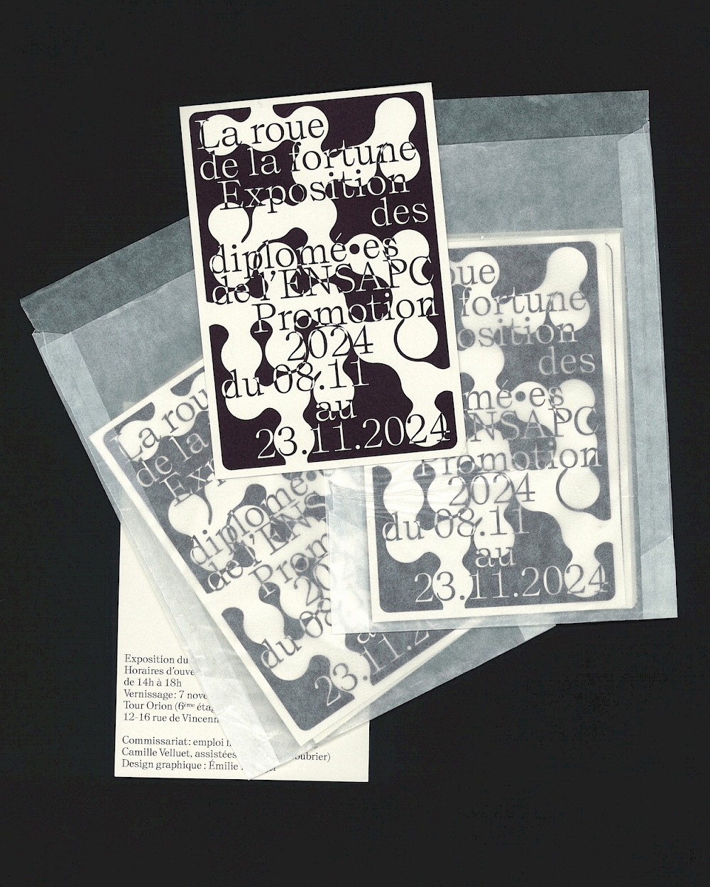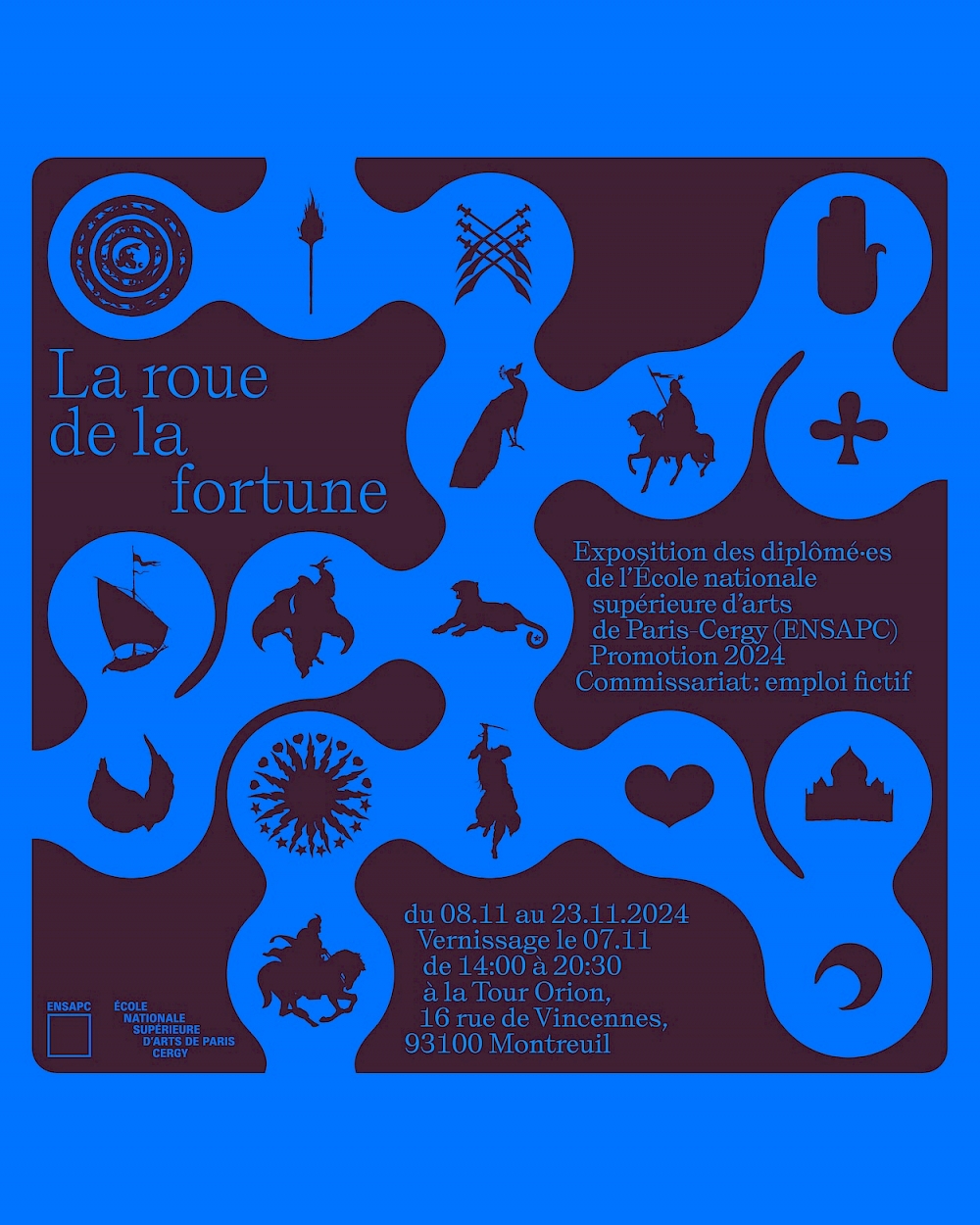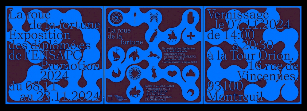 Identité visuelle de l'exposition des diplômé·es de l’École Nationale Supérieure d’Arts de Paris-Cergy (ENSAPC), à la Tour Orion (Montreuil) : affiche, feuille de salle, déclinaisons réseaux sociaux et invitations numériques, cartes présentant le travail de chaque artiste , etc.